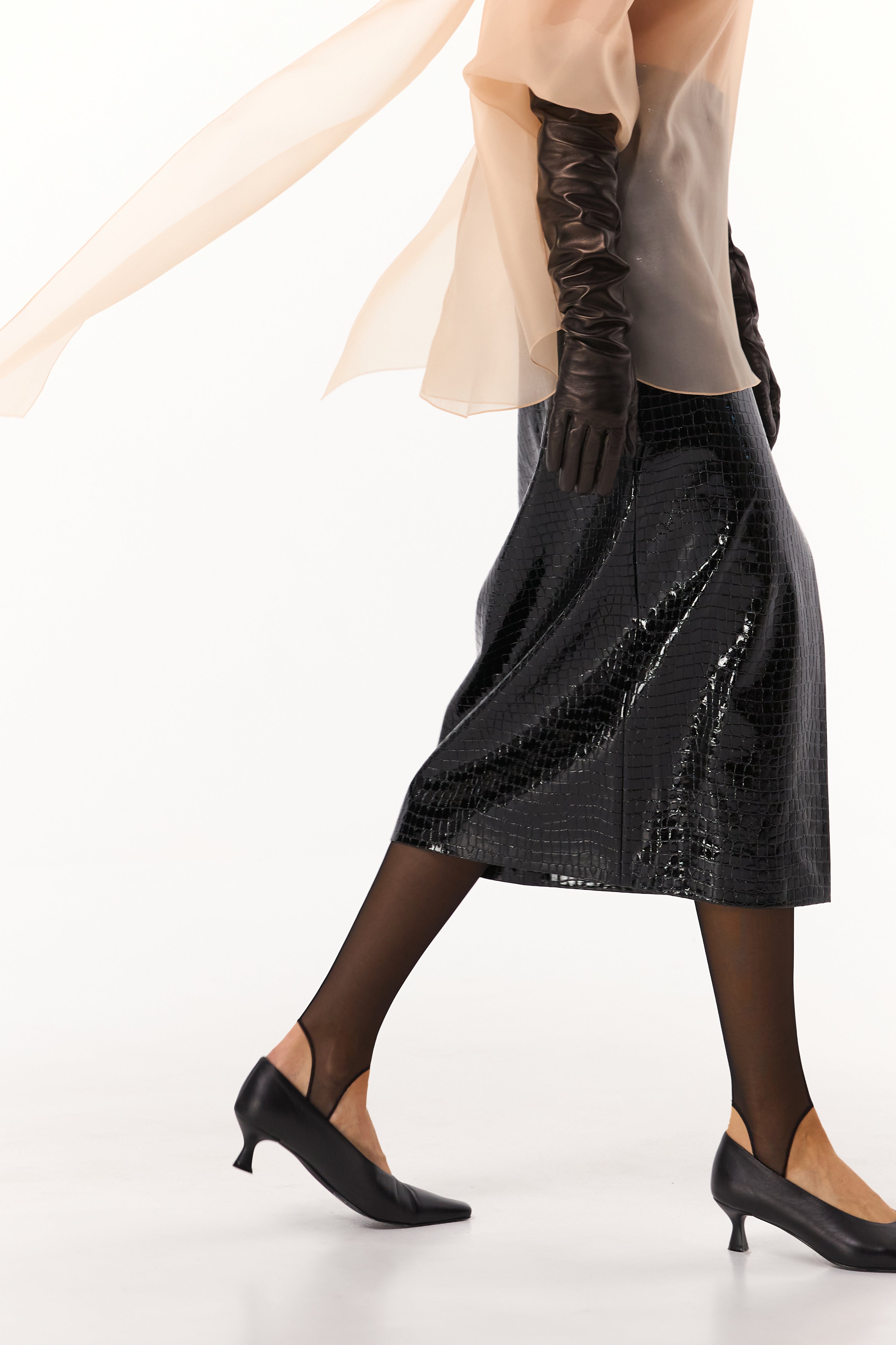 The CROCO midi skirt in black by J'amemme. The brand follows sustainable guidelines, carry zero stock, and makes every item to order.